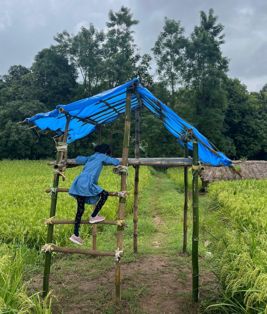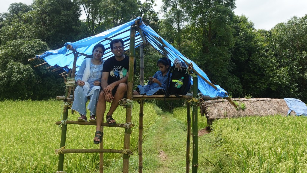 Then Siva uncle showed me the Mancha — a bamboo hut raised above the ground. It is used as a temporary shed for resting. My father said that sitting on the Mancha and gazing at the lush green rice fields was one of his favorite pastimes when he was a child. We all sat there for a while, enjoying the view and the gentle breeze.