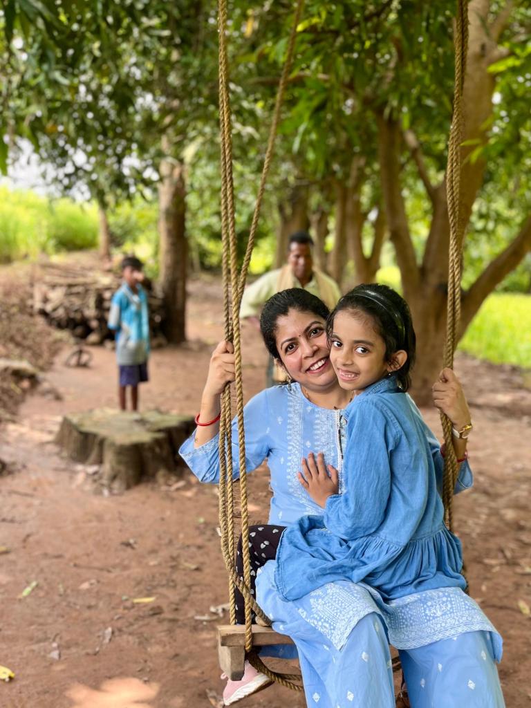 Then came a big surprise! Siva uncle had brought a swing for me. He tied it to one of the branches of the mango tree. Soon, my mother and I began swinging together. We went up and down, laughing and enjoying every moment of the ride.