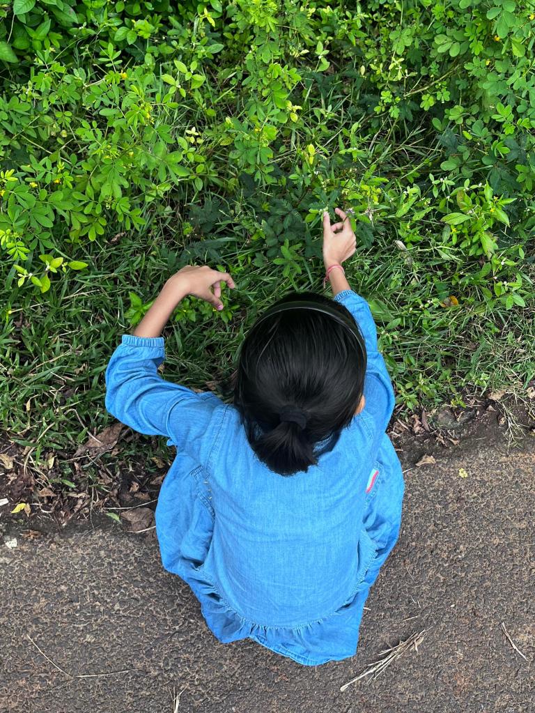 We reached my grandfather’s land by 10:30 AM. As soon as I got down from the car, my father pointed to a small creeper and said, “If you touch this plant, it will fold its leaves inward and droop. In Odia, it is called Lajakuli lata.” I smiled and told my father, “This is the Touch-Me-Not plant! I studied about it in my GK class last year.” The creeper was growing all along the roadside, and I really enjoyed playing with it.