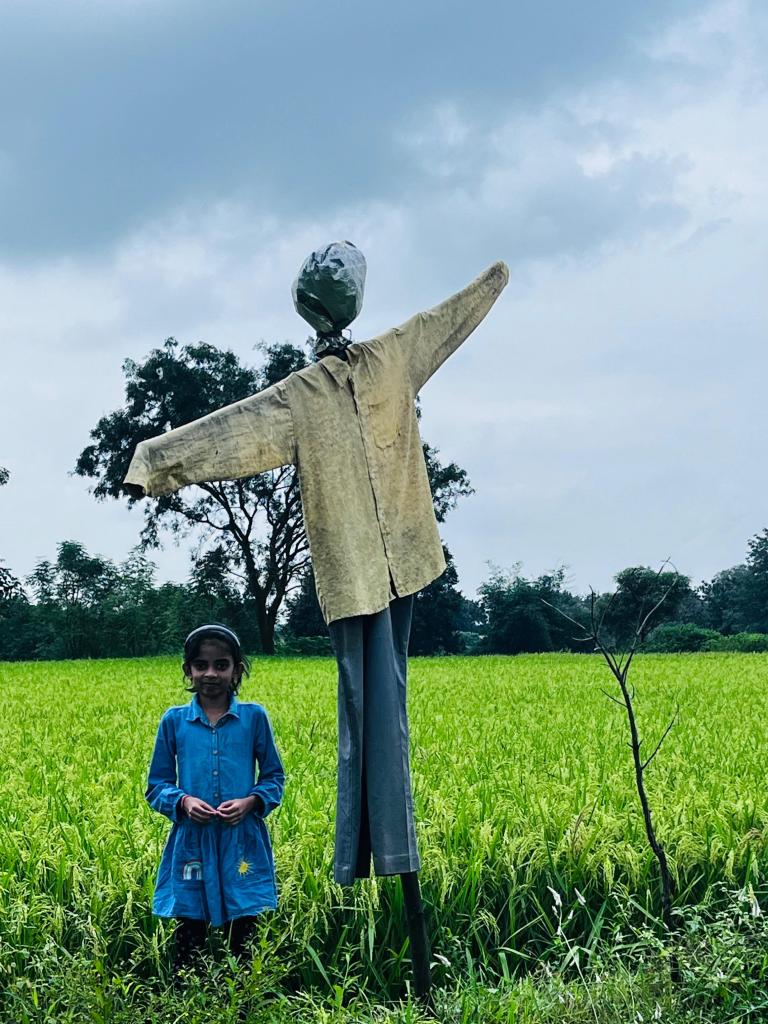 When I entered the farm, I saw greenery everywhere. In the middle of the rice field, I noticed a scarecrow, and I was very excited to take a photo with it. Siva uncle (the tenant farmer) told my father that he made it using his old torn clothes. He also said that when the wind blows, the scarecrow waves its hands. I thought that must look very scary! It can easily scare children like me.
