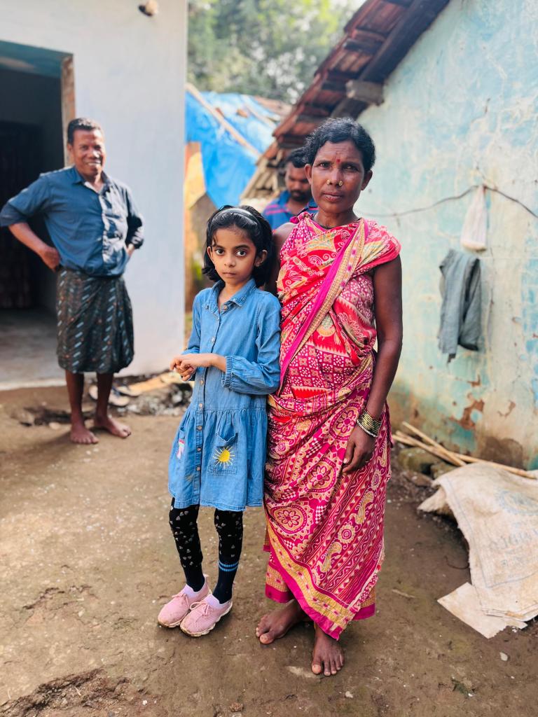 After some time, Siva uncle invited us to his home, which was on the other side of the river. As the water level was low, my father carried me on his shoulders, and we crossed the river to reach his village, Kastiguda. Siva uncle’s home was a small kaccha house, but it was very beautiful inside. He lives in a joint family with his father, two sons, two daughters-in-law, and two grandchildren. Since it was festival time, we gave them new clothes, sweets, chocolates, and toys for the kids. They, in return, offered us some fruits and local sweets.